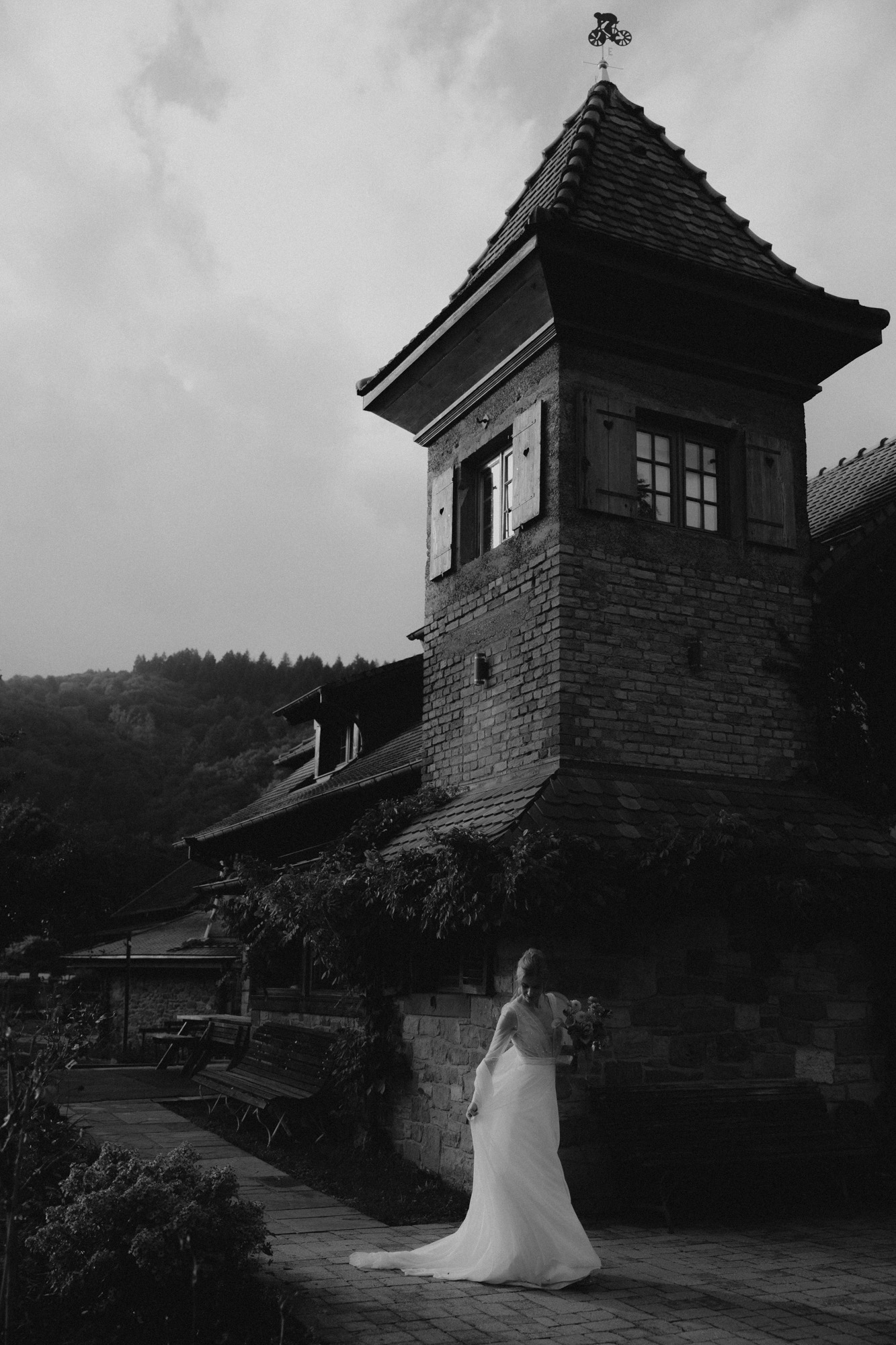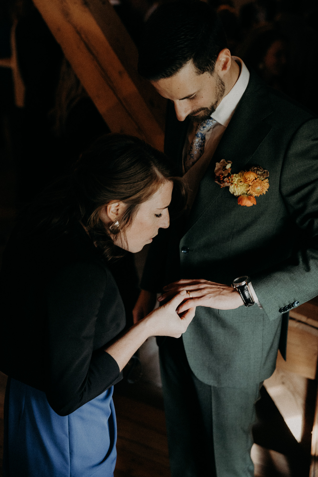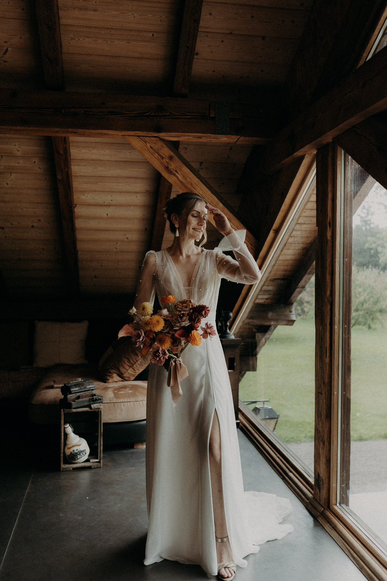 Pour ce mariage d’automne à la Drille au bord de l’eau, c’est une vraie météo de saison qui est au rendez-vous. Pluie, vent, ciel gris… Dès le début des préparatifs, nous apprécions les différents espaces qu’offrent le lieu. Fanny commence à se préparer dans la mezzanine grande et lumineuse de la salle de réception, tandis que Rémi s’habille dans l’ambiance clair-obscur de la grange. J’aime beaucoup ces deux atmosphères différentes!