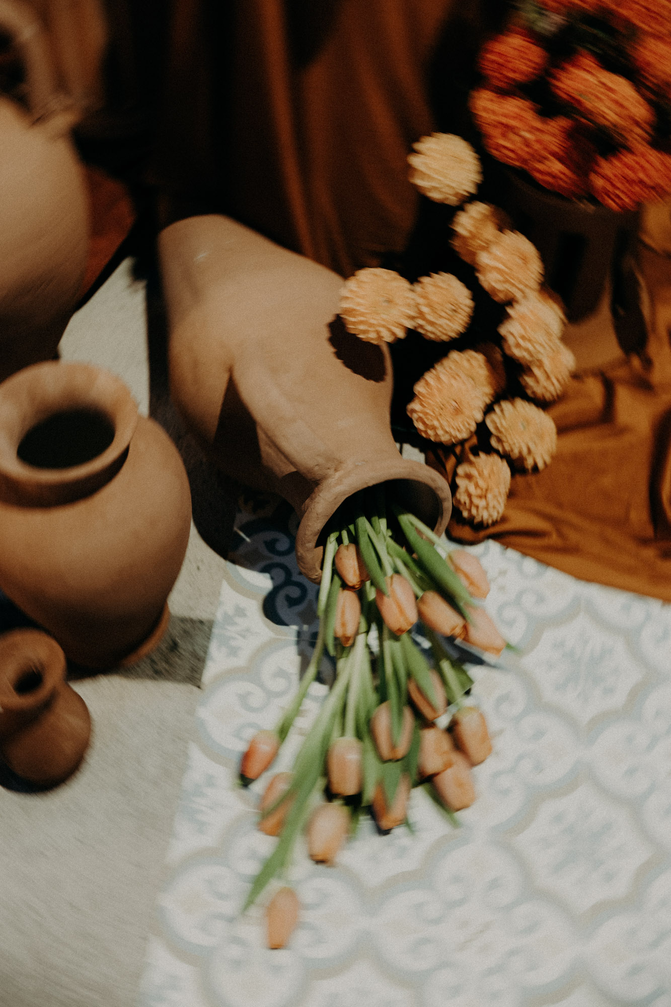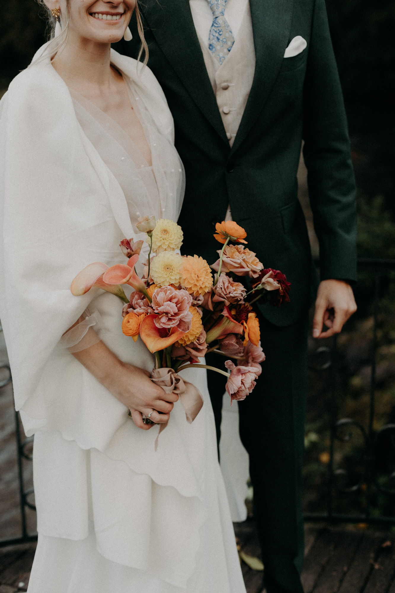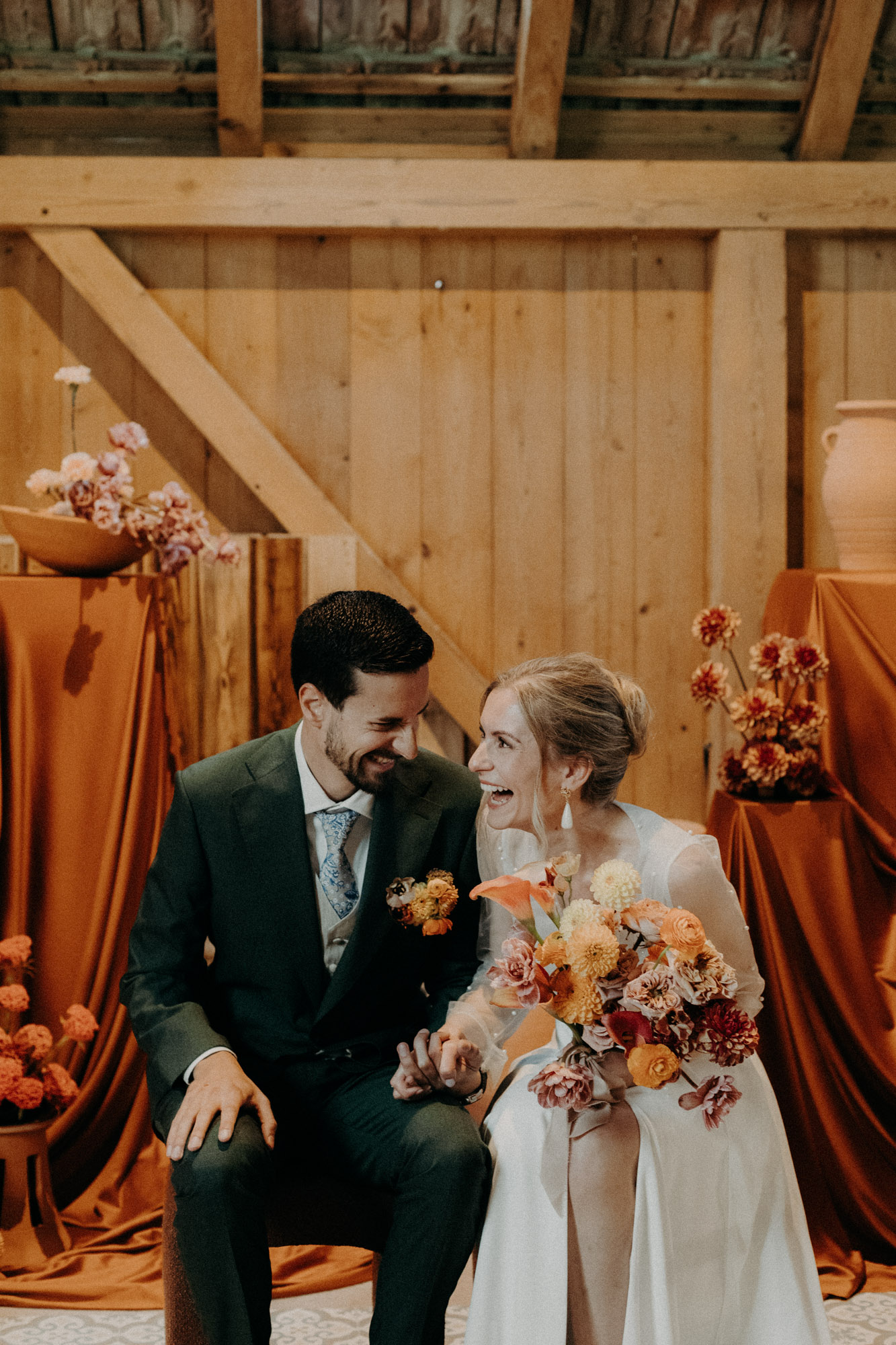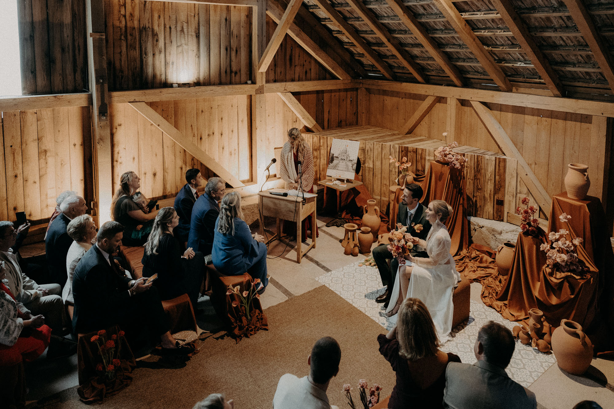 Ce que j’adore avec les mariages d’automne, c’est que la saison s’impose comme base pour l’ambiance et la décoration du mariage. Tout naturellement, les fleurs, les matières, et les objets se teintent de couleurs chaudes, earthy, réconfortantes. Pour ce mariage d’automne à la Drille au bord de l’eau, une ancienne scierie réhabilitée, c’est la talentueuse Alice Blondel qui a imaginé une ambiance absolument canon. Même si le lieu se suffit presque en lui même, et s’intègre très bien dans un décor automnal, la scénographie imaginée par Alice, et fleurie par Atelier Léoncie sublime le tout. Le thème automnal se voit alors totalement approprié par la décoratrice et les mariés, pour créer quelque chose d’unique, de personnel, et magnifique. Vases en terre cuite, compositions florales modernes et drapés viennent sublimer l’espace de cérémonie laïque, tandis que le bleu et les inspiration portugaises viennent faire écho aux origines de la mariée, pour contraster avec les couleurs chaudes de la salle de réception… Voilà un tableau bien agréable à photographier!