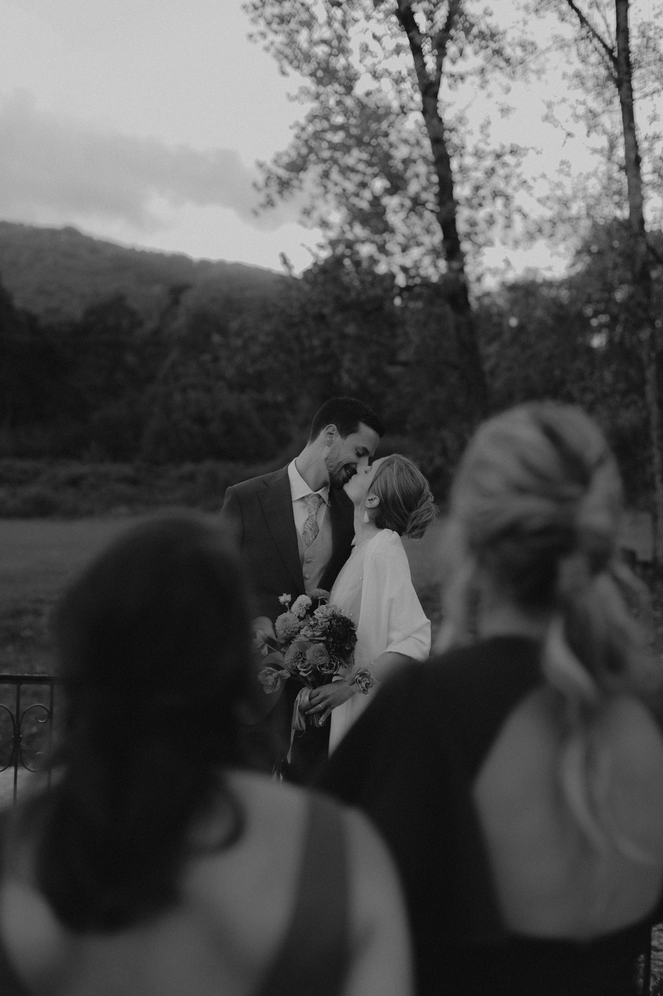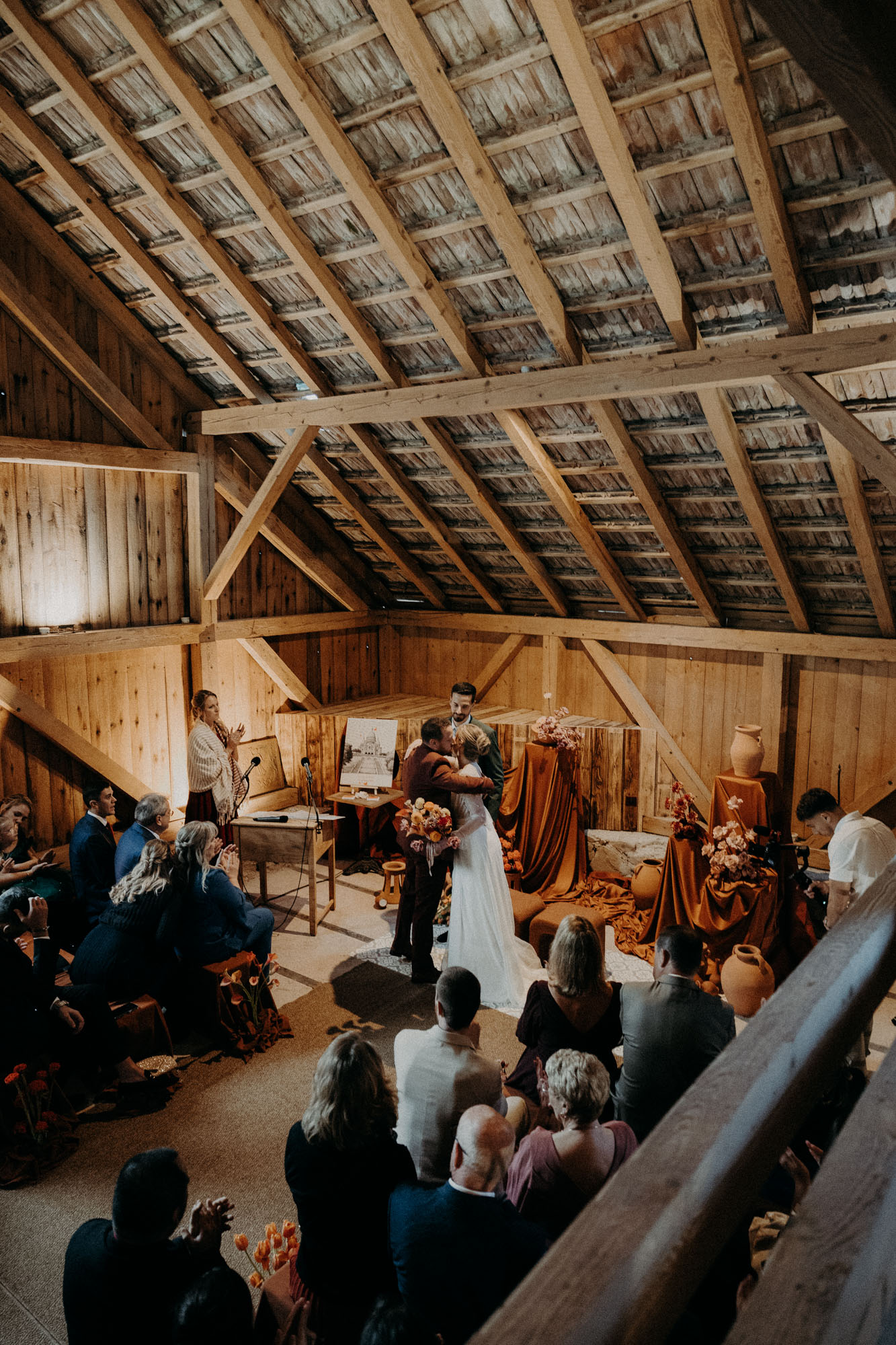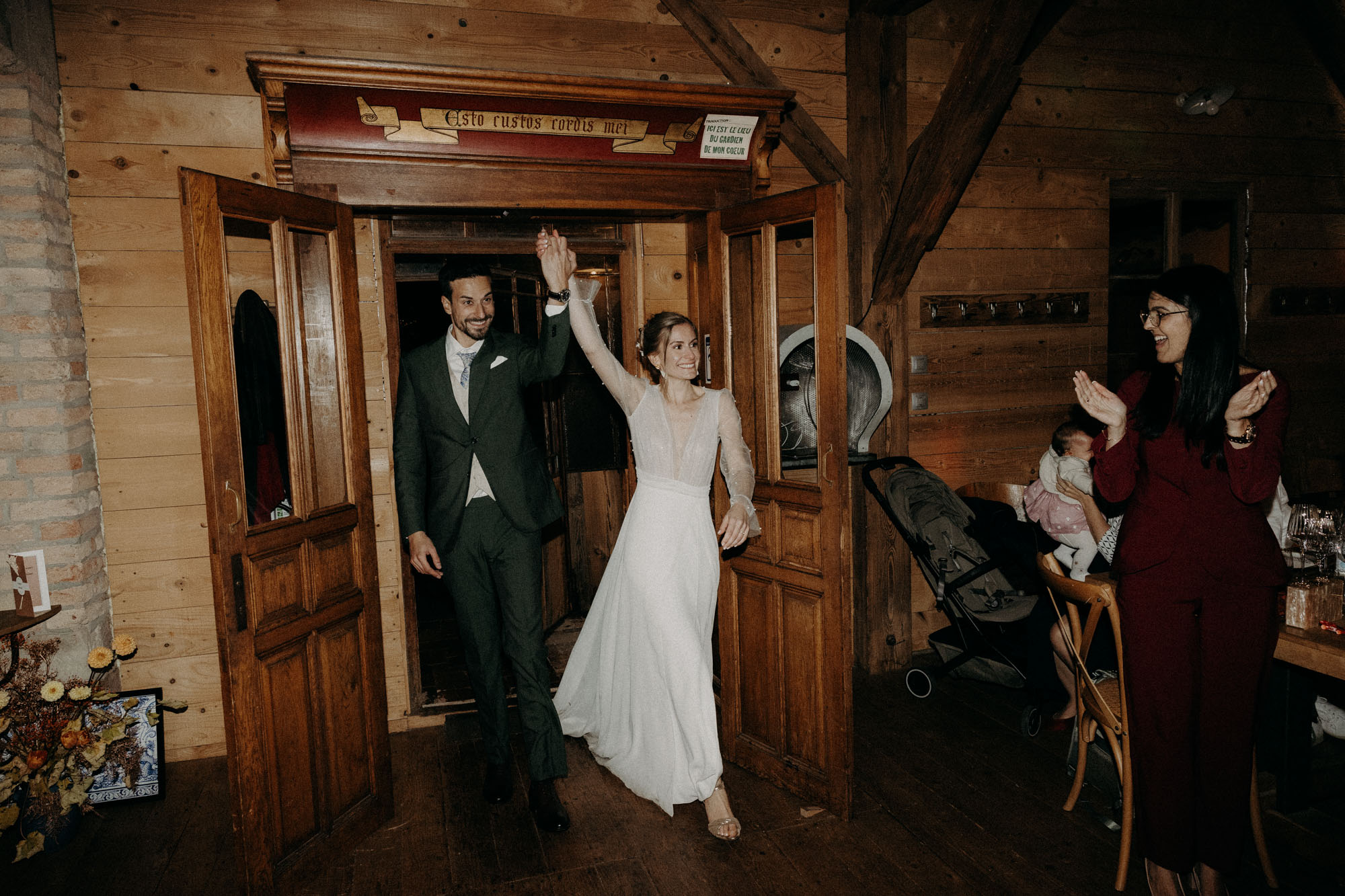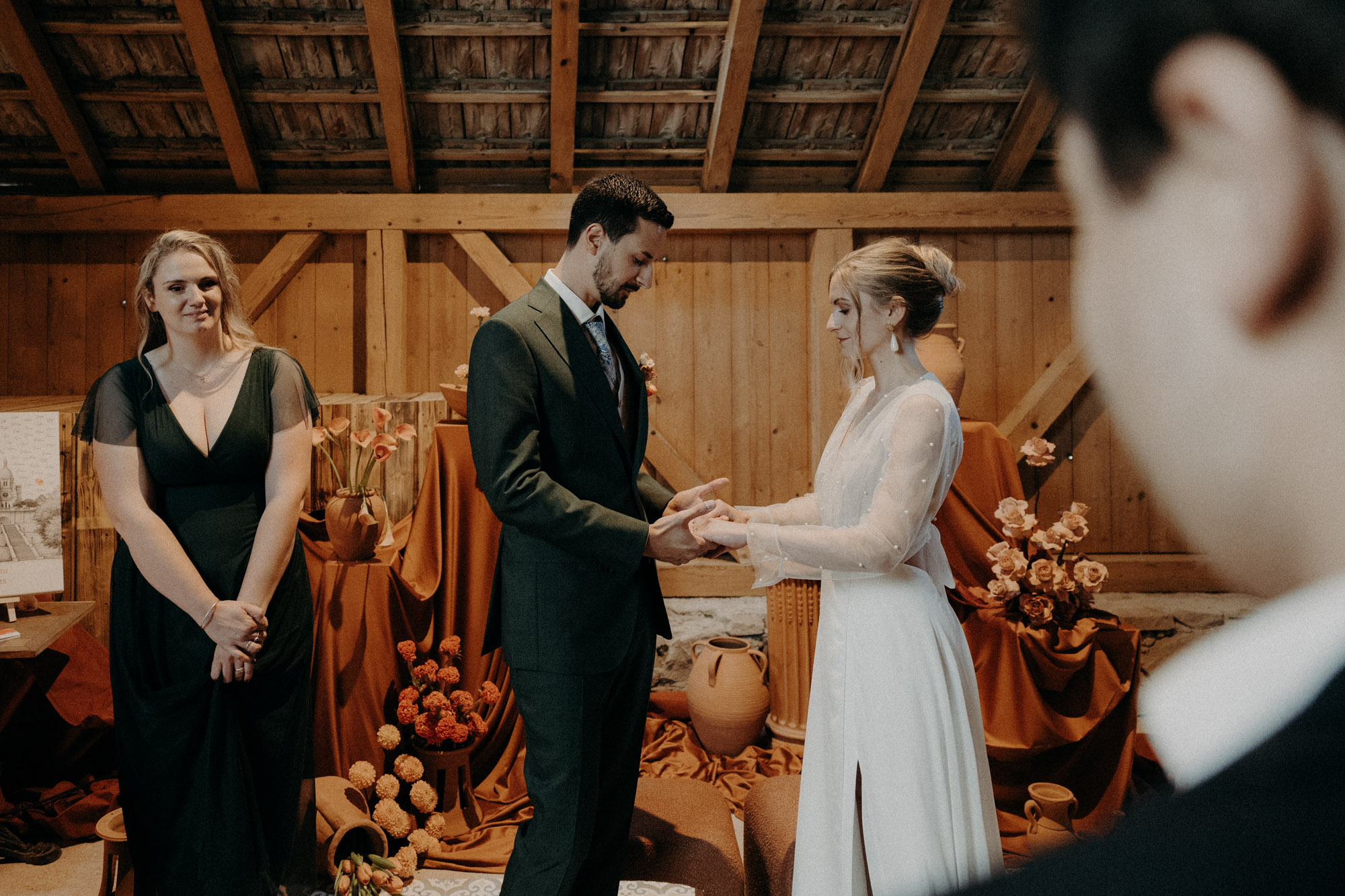 Le moment de la cérémonie venu, les invités s’installent dans la grande pour la cérémonie, et nos deux amoureux se découvrent devant leurs proches. Rémi, le regard admiratif et plein d’amour, Fanny, les yeux embués et humides. L’émotion se fait ressentir chez tous les convives, et il en sera ainsi tout du long. Et puis, juste après la cérémonie, une magnifique éclaircie s’impose parmi les nuages, après a pluie battante, pour nous offrir une lumière magique pour la séance photo de couple.